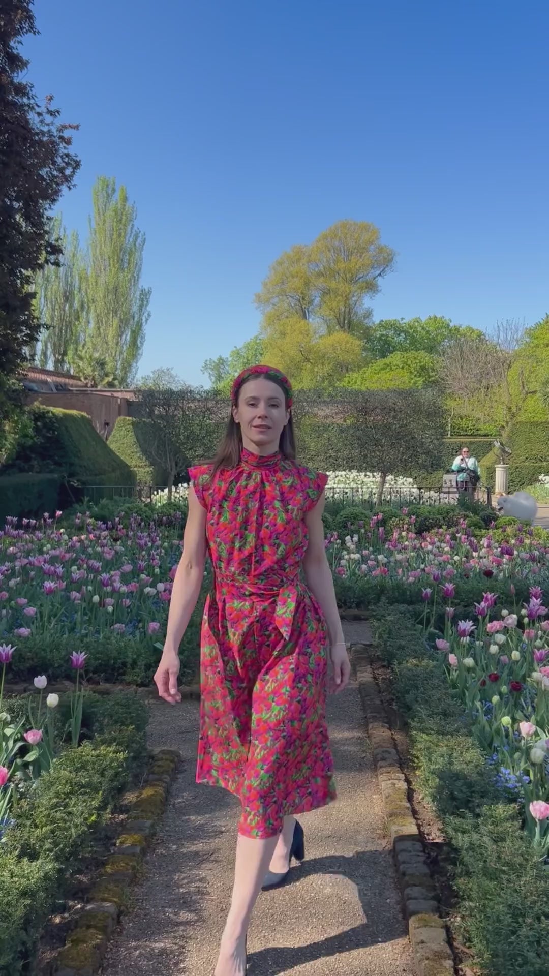 A midi length silk bamboo dress in our halter neck style with cap sleeves now comes in a vibrant new Tulips print. Wear it loosely without the belt or create a more fitted look with the matching tie belt.