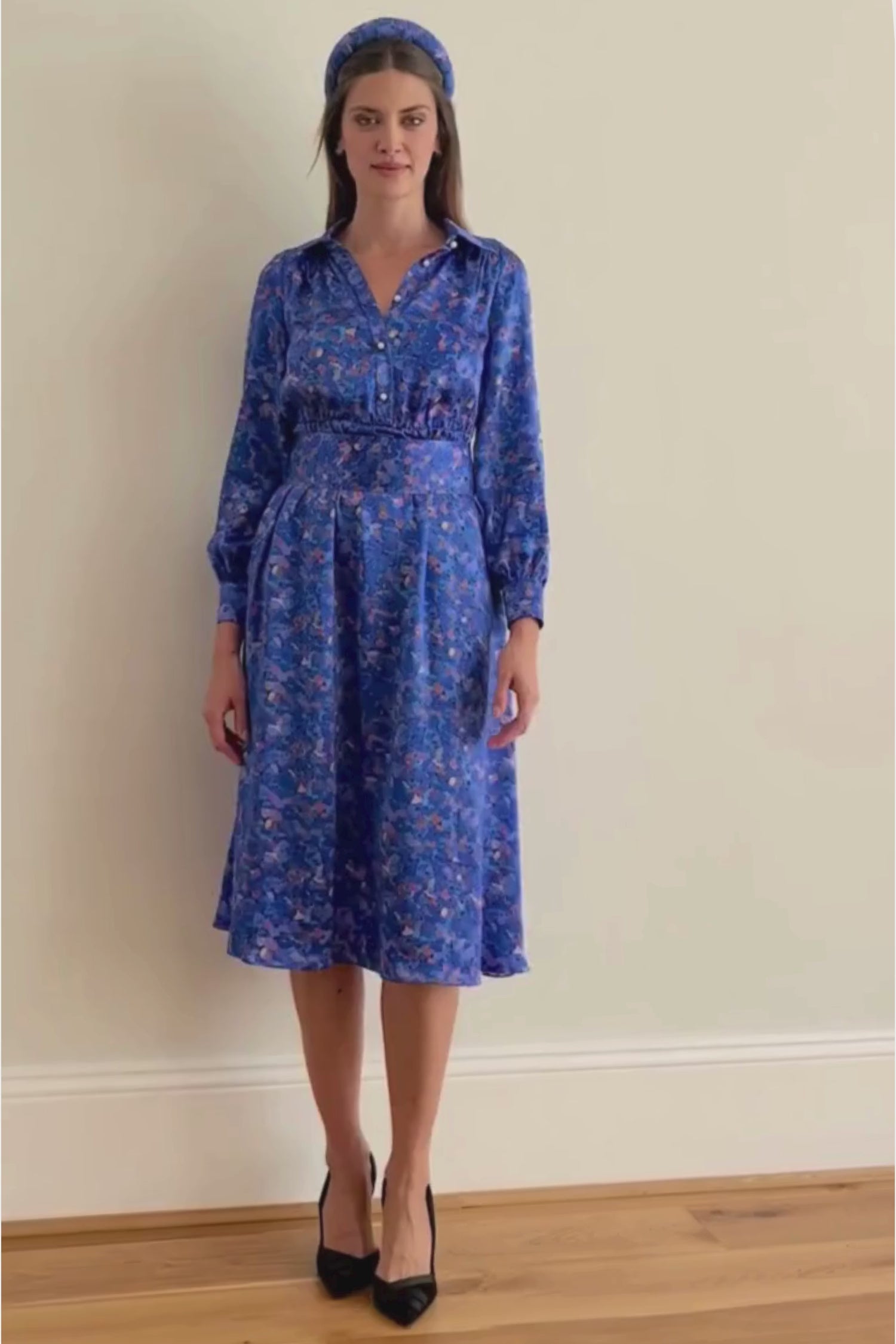 Our Fiona Dress in 100% silk satin has a flattering elastic waist to enhance the waist and pretty pearl button detail. Dress it up for formal events or wear it more casually during the day.