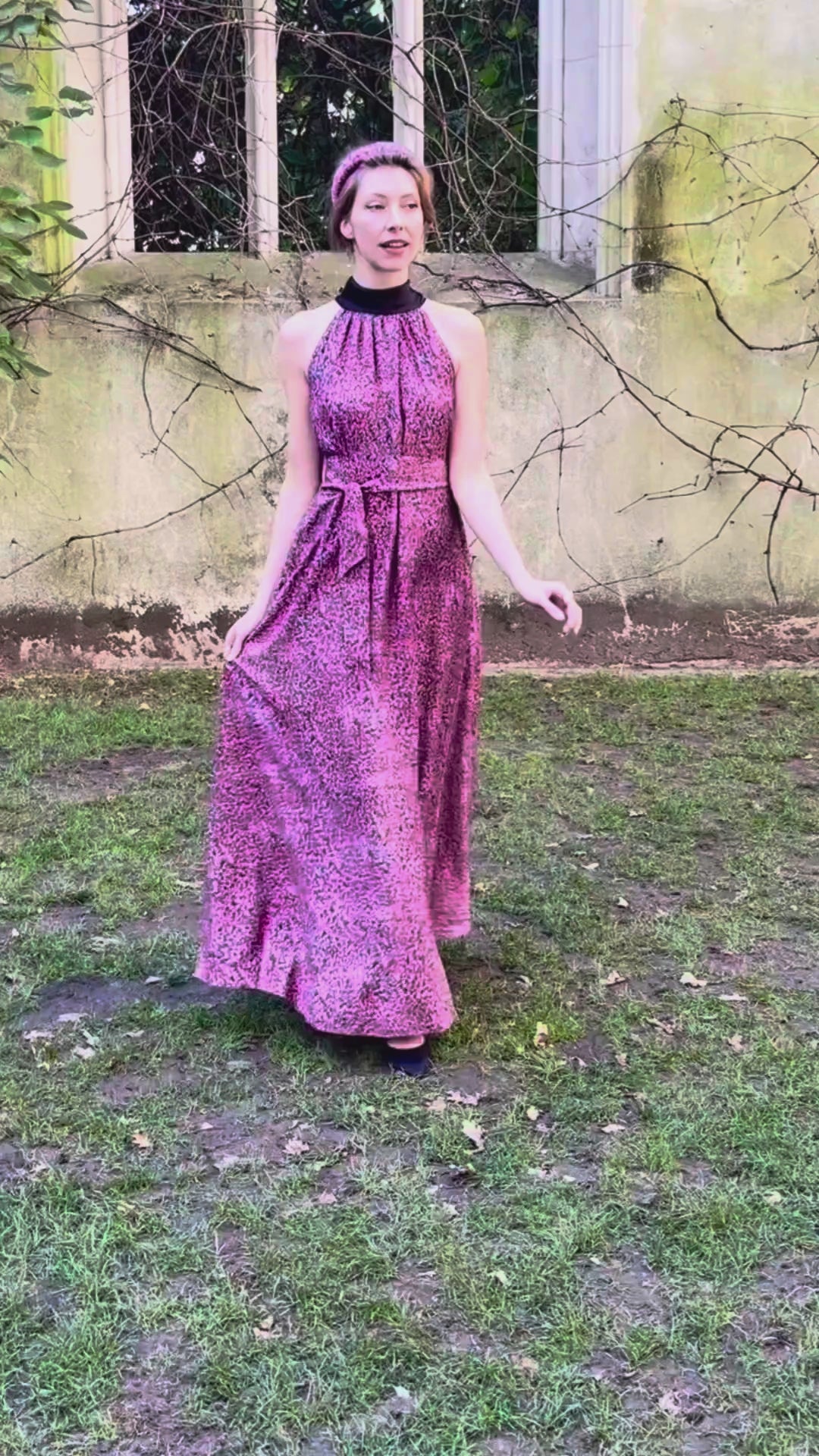 A glamorous long reversible silk bamboo dress in a beautiful pink and purple Violet Dream print with a classic black reverse side. The fabric makes this dress perfect for all occasions due to its easy wearing and care qualities. It will keep you warm in the colder months and cool in the warmer months.