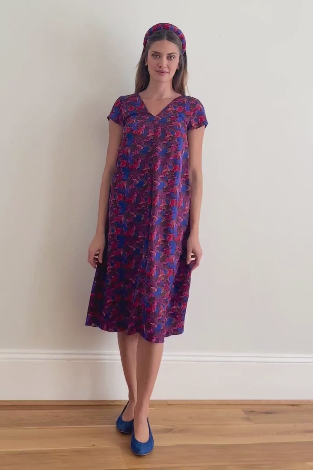 Our Eva Dress now comes in a new Silk Wool Tencel sustainable fabric in our Stormy Night print. Pair it with black tights and boots to create a winter look. The Stormy Night print was hand painted by Isabel with inspiration from a stormy sky at sunset. Isabel chose a mixture of blues, oranges and purples with a hint of brown to create a warming wintery print.